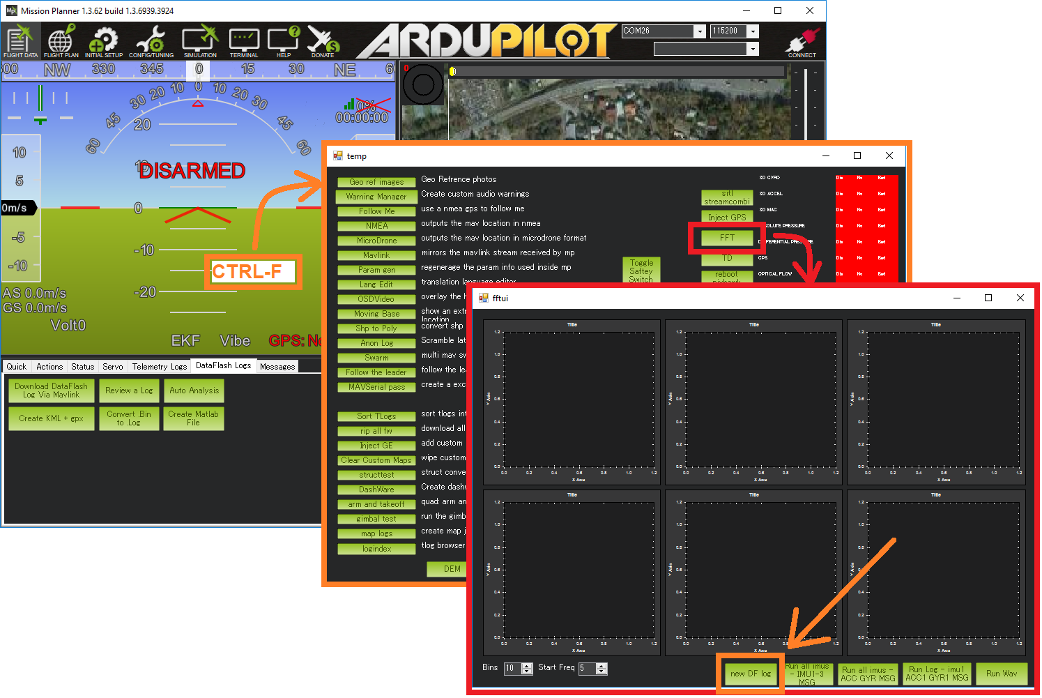 - Open Mission Planner, press Ctrl-F, press the FFT button, press “new DF log” and select the .bin log file downloaded above