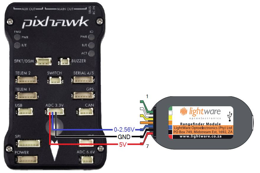 The SF10’s Analog Out pin (5) should be connected to the Pixhawk’s 3.3V ADC (analog to digital converter). The Pixhawk will provide the regulated 5V power supply needed by the sensor using the 5V and GND pins of the ADC connector.