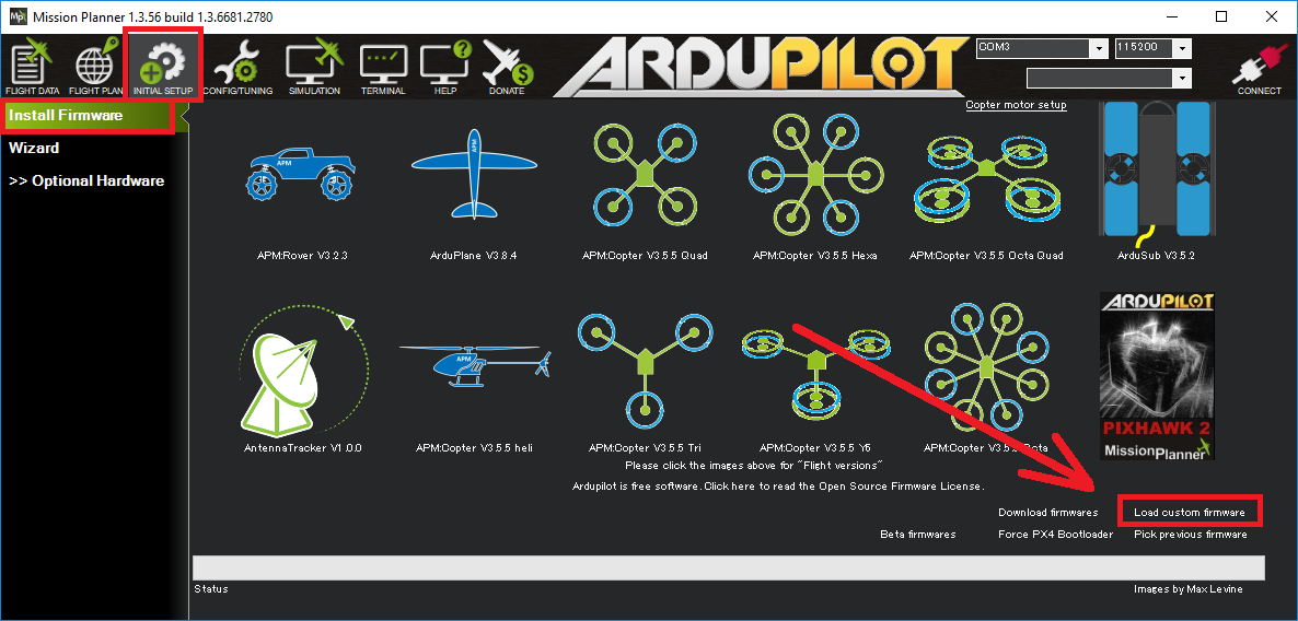- go to the GCS’s firmware install screen. If using the Mission Planner select “Initial Setup >> Install Firmware”