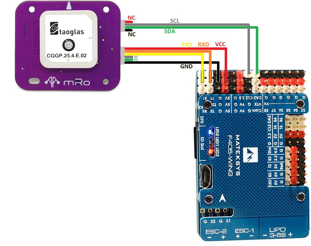 This board does not include a GPS or compass so an external GPS/compass should be connected as shown below in order for autonomous modes to function.