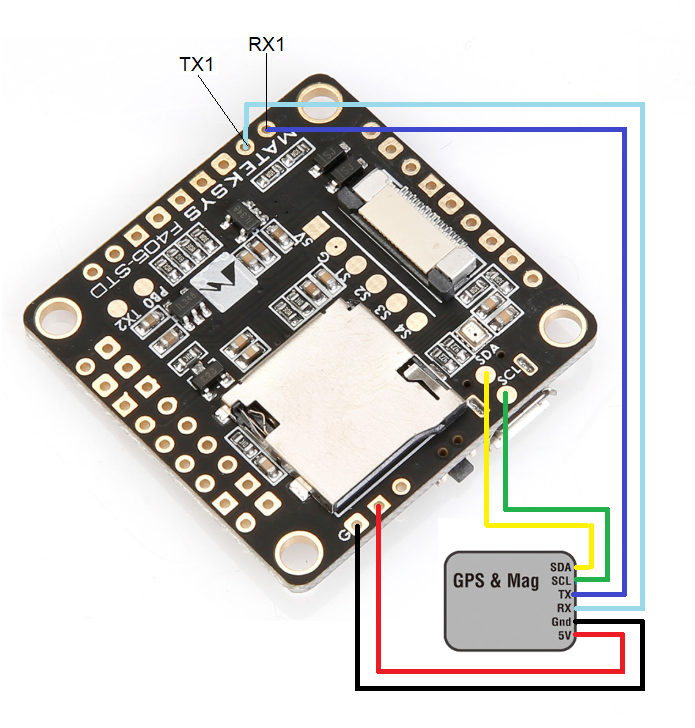This board does not include a GPS or compass so an external GPS/compass should be connected as shown below in order for autonomous modes to function.