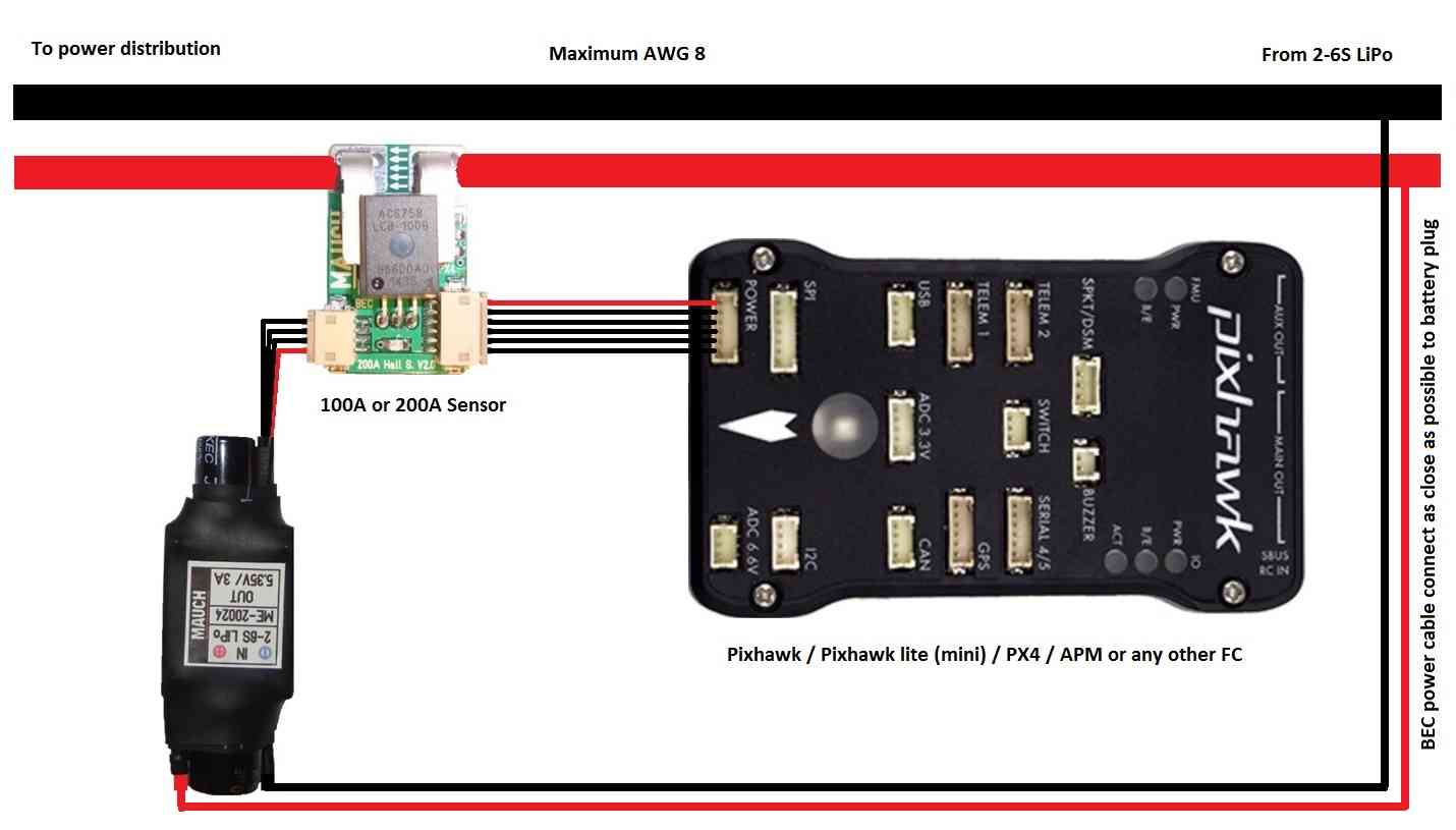 - Supply voltage to Pixhawk / APM = 5.35V/3A (with attached LV- or HV-BEC)