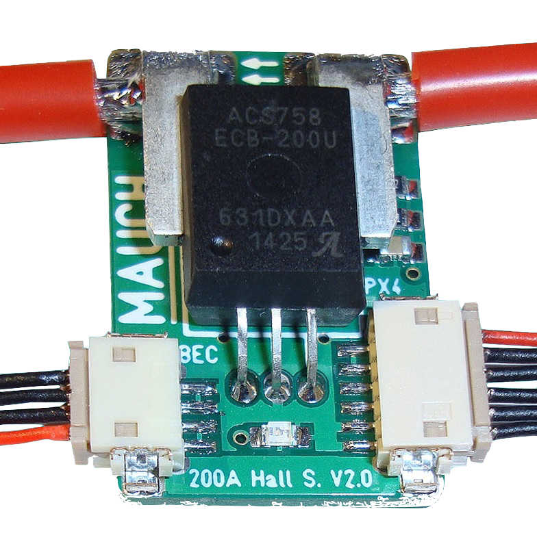 MAUCH has a number of PMs, which are compatible with Pixhawk, APM, Pixhawk lite, AUAV-X2, DroTek und CUAV Pixhack. The sensors boards are capable of delivering 100A continuous current for HS-100-V2 and 200A for the HS-200-V2 (without any time limit). The maximum burst current is 1200A@25’C and 800A@85’C for 1 second.