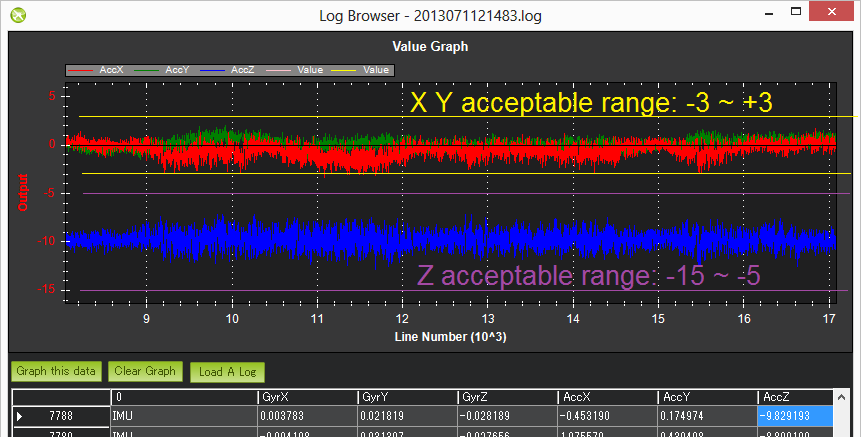 Check the scale on the left and ensure that your vibration levels for the AccX and AccY are between -3 and +3. For AccZ the acceptable range is -15 to -5. If it is very close or over these limits you should refer back to the Vibration Damping page for possible solutions.