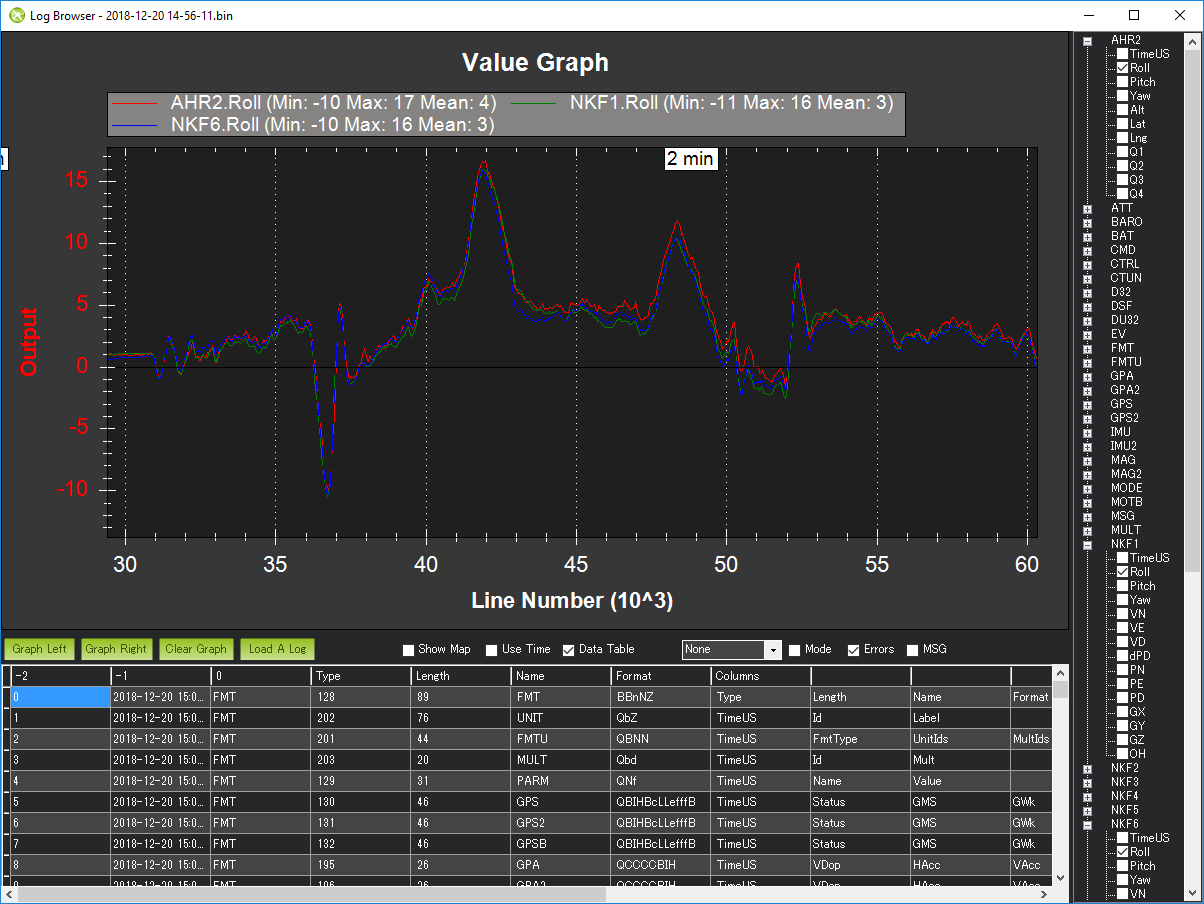 - Compare the AHRS2.Roll, NKF1.Roll and NKF6.Roll