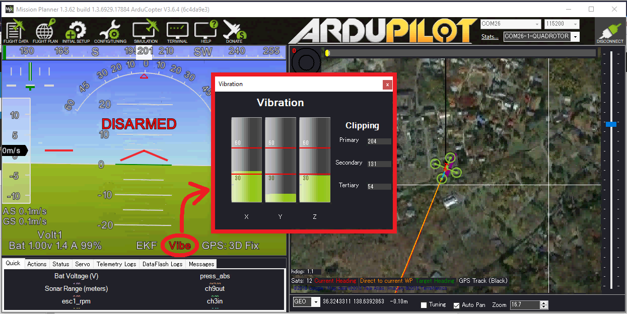 Ground Stations can display a real-time view of vibration and clipping. If using the Mission Planner click on “Vibe” on the HUD to display the current vibration levels.