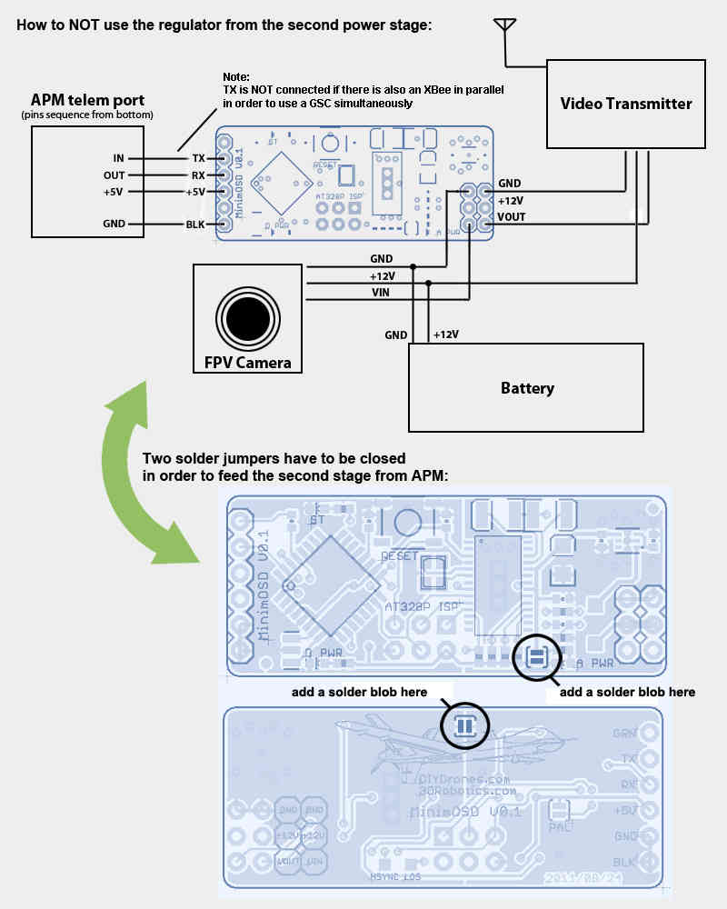 The second stage regulator from the MinimOSD boards earlier than V1.1 gets too hot on 12V video setups. If your frame has not a good air flow for cooling the OSD board you may want to feed the OSD entirely from APM. Probably it will add some noises from servos, but you’ll be more safe by this way: