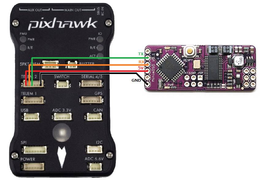To connect to Pixhawk, use this DF13 6-pin cable to connect to the TELEM2 port. To connect to APM 2.5 and 2.6, use a 5-pin splitter cable that allows the telemetry port to be connected to both a SiK Radio and the MinimOSD.