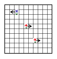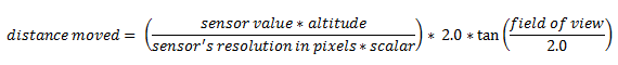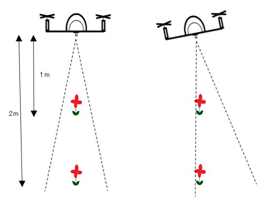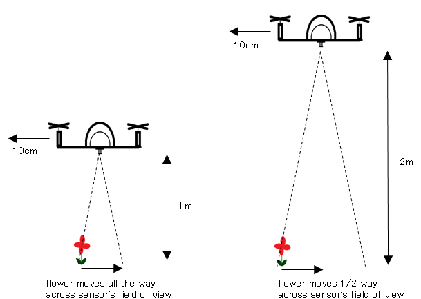 In order to convert values from the sensor to real distances moved, we need to take into account the altitude. This is necessary because as you can see from the two pictures below, if we have two quads moving the same distance, but one at a low altitude, the other at a higher altitude, the lower quad will see surface features appear to move further and this will result in a higher optical flow values