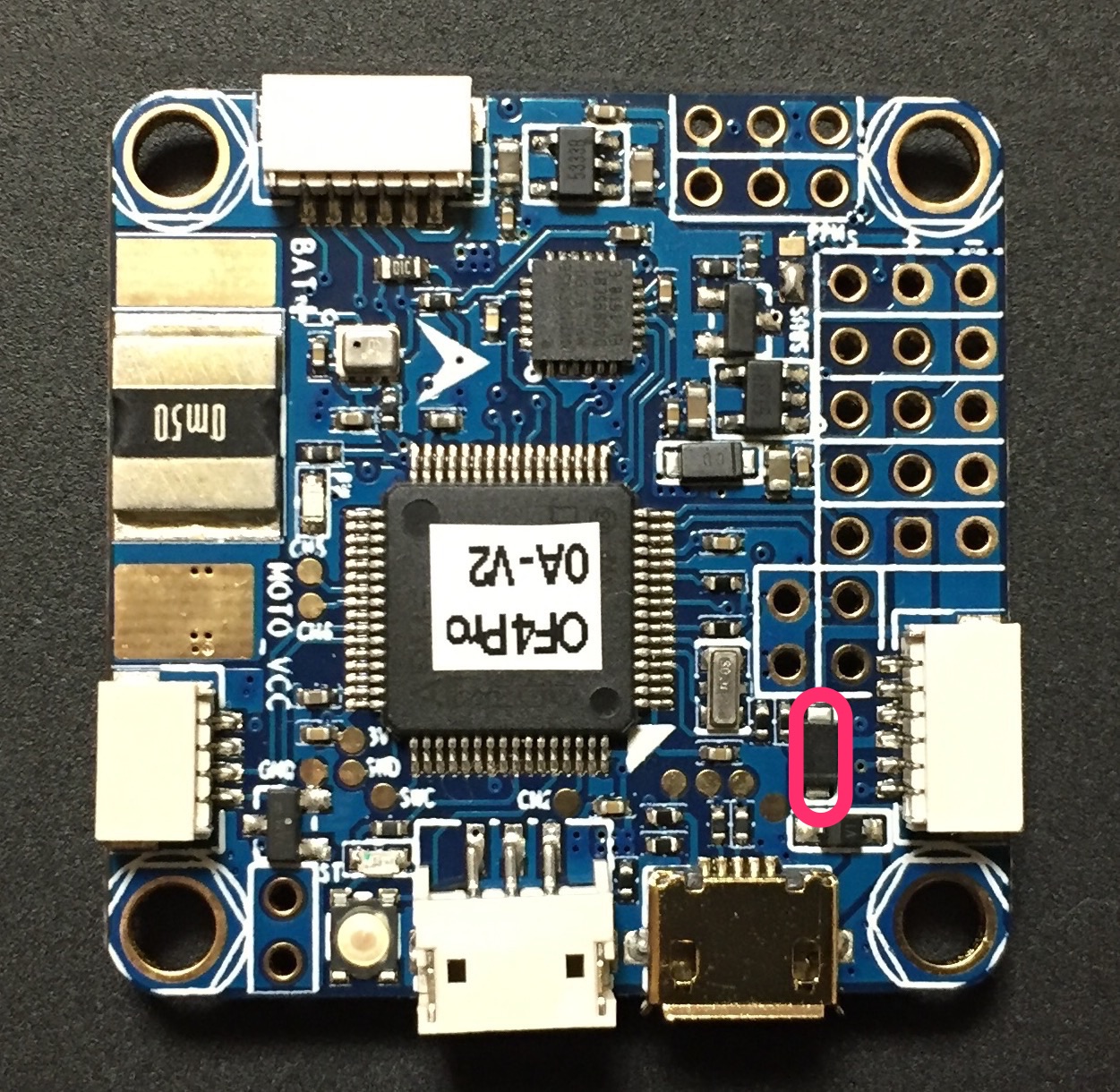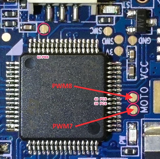 The Pro version has 6 PWM outputs available on thru-hole pads, and two additional (PWM7 & PWM8) on the rear, via solder pads above the “MOTO” silk screen printing. The AIO version only provides 6 PWM outputs via thru-hole pads.