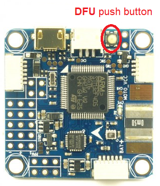 To do this, you’ll need to locate the DFU jumper on your board. On most board flavours this is a little push button thas needs to be pressed while connecting your board to your PC via USB: