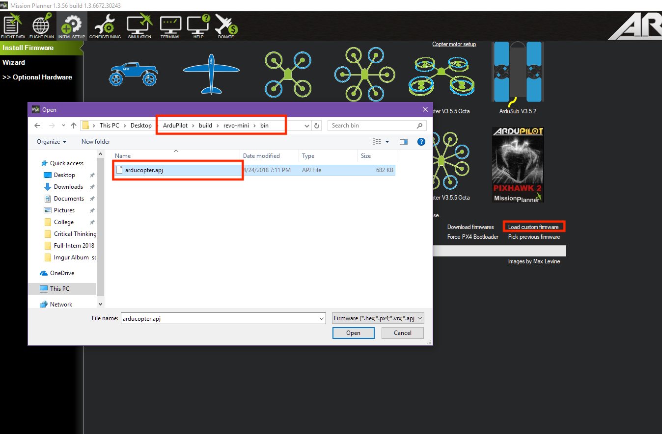 Congratulations! You’re now running ArduPilot on your omnibusF4. You can use this same process to upgrade to newer versions of ArduPilot. Either use MP’s firmware update functionality or compile your own desired vehicle firmware from source and upload the .apj file to the board.