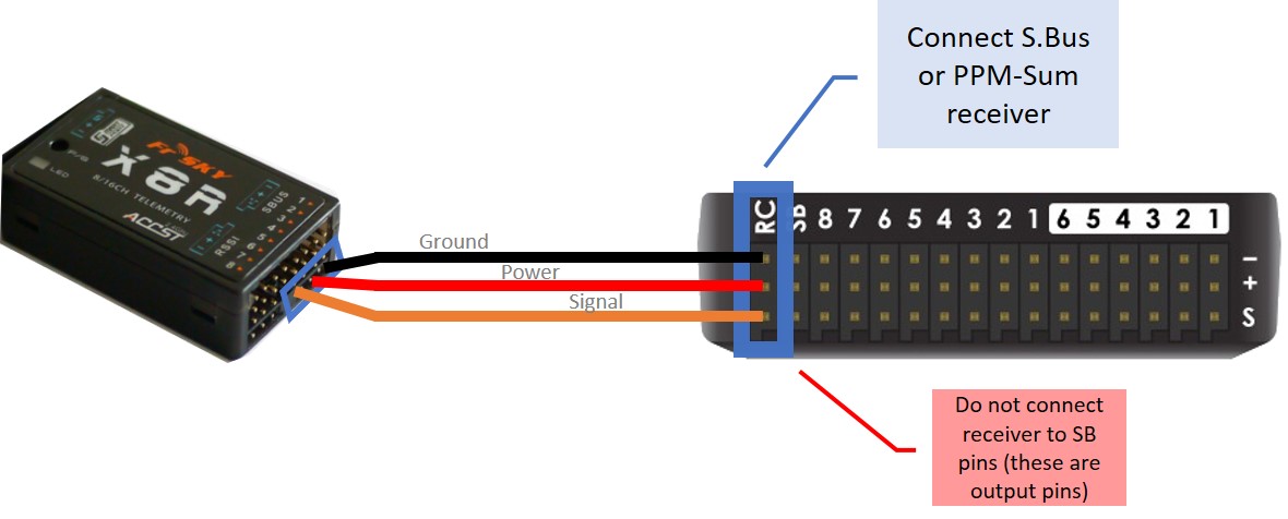 To connect a PPM-Sum receiver or an S.Bus receiver, plug the ground (black), power (red) and signal (usually white - orange in the diagram below) wires to the RC pins on the Pixhawk. The following S.Bus receivers have been tested and are known to work: FrSky X8R, FrSky XSR, Futaba R2008SB, Futaba R6008SB.