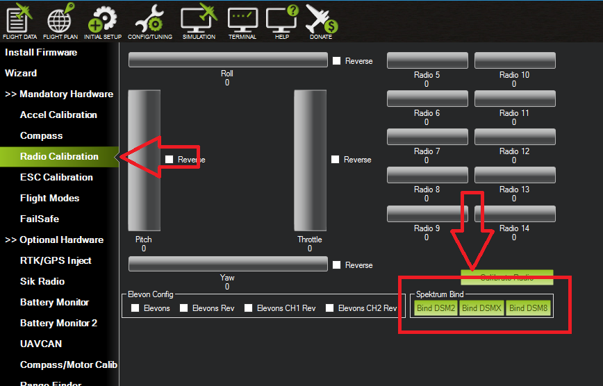 - The satellite receiver can be bound to transmitter with Mission Planner. This functionality is located in Radio Calibration screen on Initial Setup.