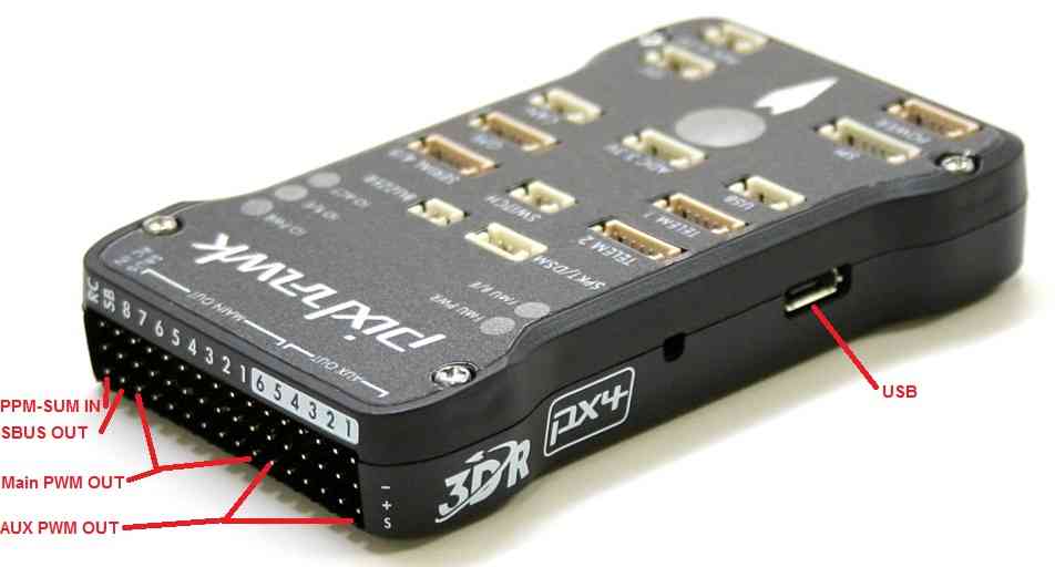 Pixhawk PWM connectors for servos and ESCs and PPM-SUM in and SBUS out¶