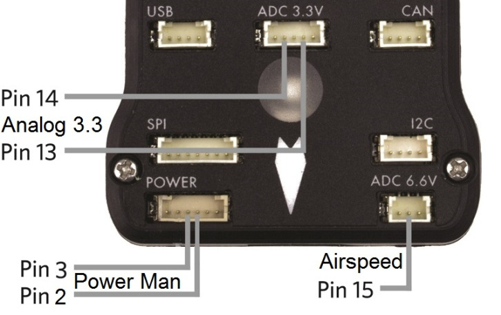 Virtual Pin 15 and ADC 6.6V connector Pin 2: analog airspeed sensor port. This has 2:1 scaling builtin, so can take up to 6.6v analog inputs. Usually used for analog airspeed, but may be used for analog sonar or other analog sensors.