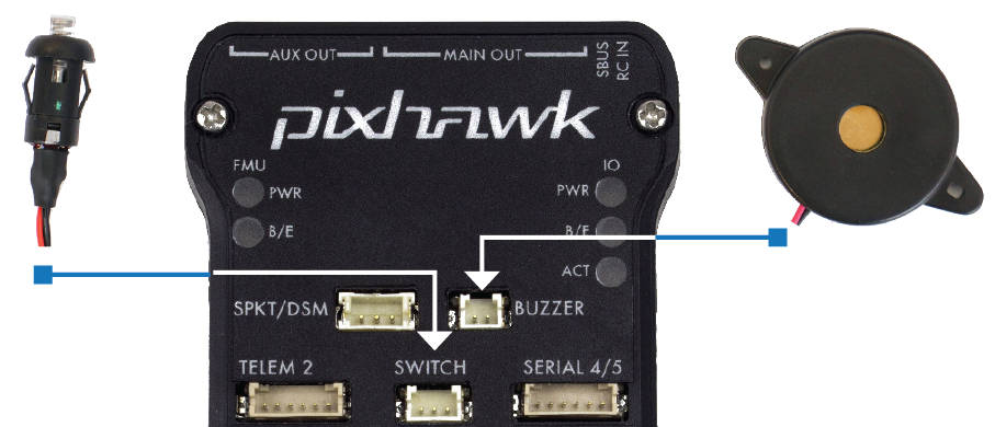 The buzzer and safety switch button are mandatory for Pixhawk. Connect to the BUZZER and SWITCH ports as shown.