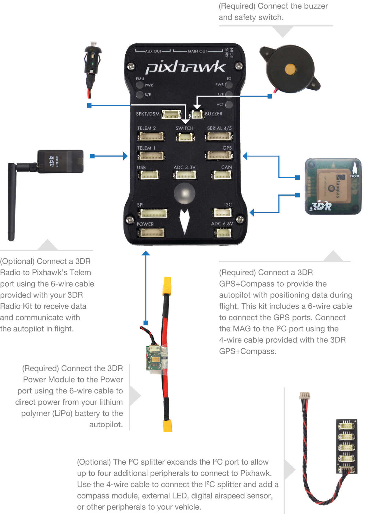 Information about connecting these peripherals to Pixhawk is found in the respective pages.