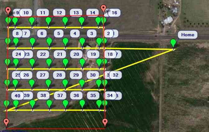 To do this, in the right-click menu select Polygon and draw a box around the area you want to map. Then select Auto WP, Grid. Follow the dialog box process to select altitude and spacing. The Mission Planner will then generate a mission that looks something like this: