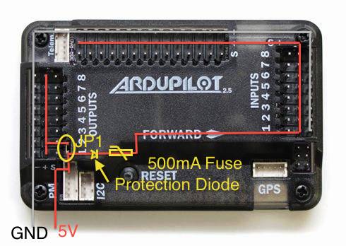 It’s also possible to power APM 2.5 from two separate sources, one powering the RC system on the input side, and the other powering the output side (servos or ESCs). This is determined by a jumper on the JP1 pins (see below). If the jumper is on, which is the factory default, the board is powered from the OUTPUT rail or the USB. If the jumper is off, the board is powered from the INPUT rail, but the OUTPUT rail will need its own power source. This configuration is used if you want to have two separate power sources in your aircraft, one powering the servos and the other powering the electronics. The ideal input voltage is 5.37v +/-0.0v and may not be provided by a typical ESC.