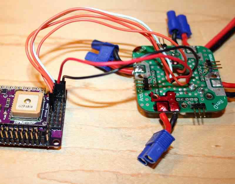 On the bench, you’ll probably be powering the board via your USB cable while you set it up and test it. But in your aircraft, you’ll need to power it with your on board power system, which is usually your LiPo battery going through an ESC or the Power Module. In the case of a multicopter, this can come through your Power Distribution Board (PDB), which will break out the 5V output from the one of the electronic speed controls (ESCs) or the Power module which is wored directly to the battery.