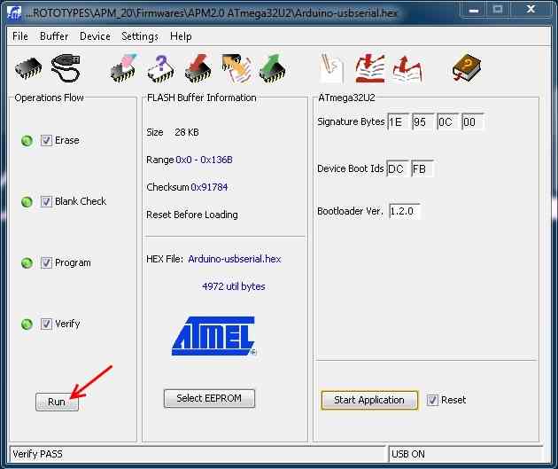 - Now just press the “Run” button indicated with a red arrow and the system will upload the new firmware.