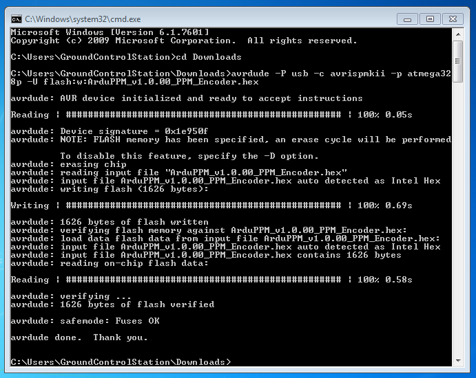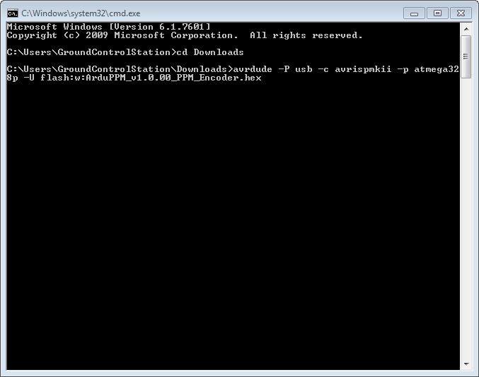 Then type the command: avrdude -P usb -c avrispmkii -p atmega328p -U flash:w:ArduPPM_Vx.x.x_PPM_Encoder.hex (substitute x.x.x with the your version number)