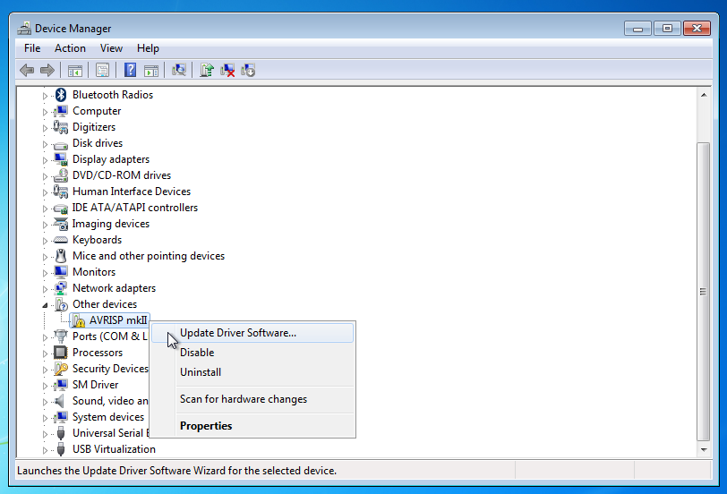 Open the device manager and select the AVRISP mkII, choose “Update Driver Software…”
