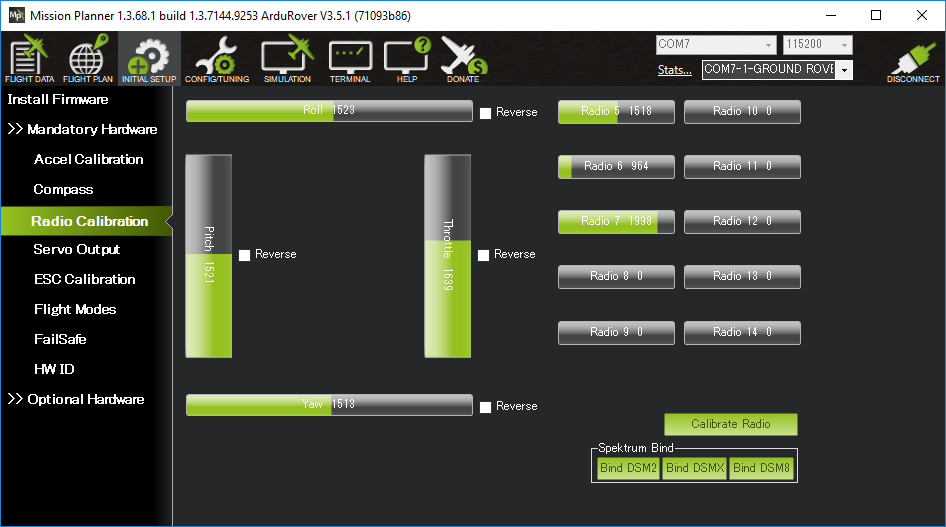 On the Mission Planner press the “Connect” button and open Mission Planner’s INITIAL SETUP | Mandatory Hardware | Radio Calibration screen