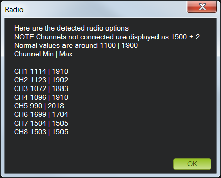 Mission Planner will show a summary of the calibration data. Normal values are around 1100 for minimums and 1900 for maximums.