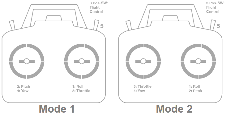 - Mode 2: left stick controls throttle and yaw; the right stick will control pitch and roll.