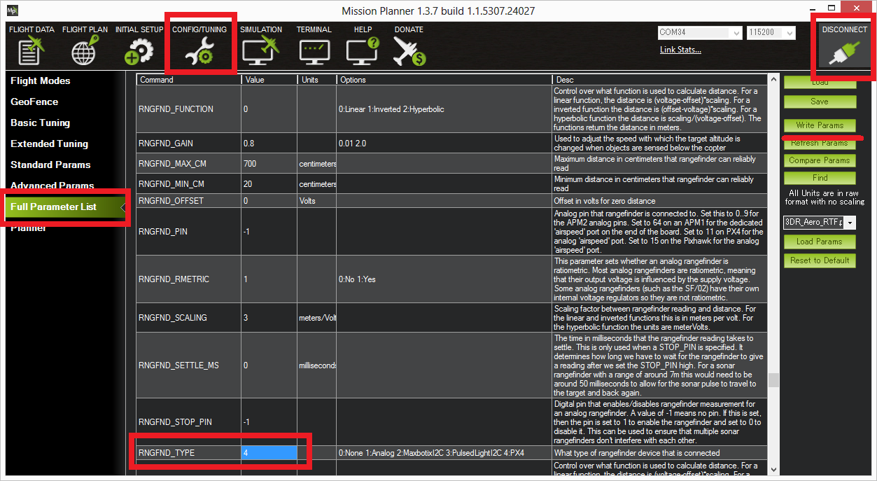 Note: For RNGFND_SCALING your mileage may vary. Some units work better using RNGFND_SCALING=0.8.