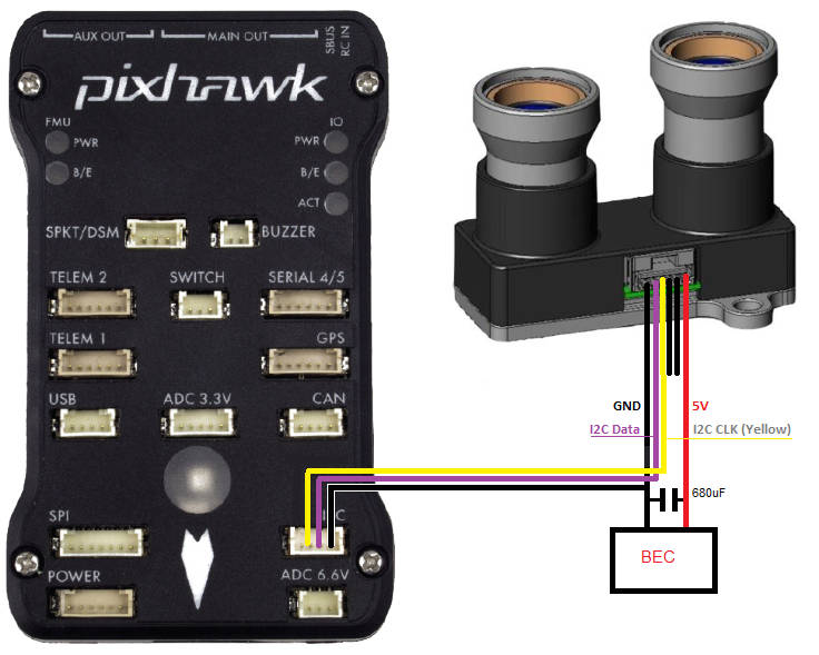 The power to the rangefinder should be supplied from a separate external BEC as shown in the diagram below.