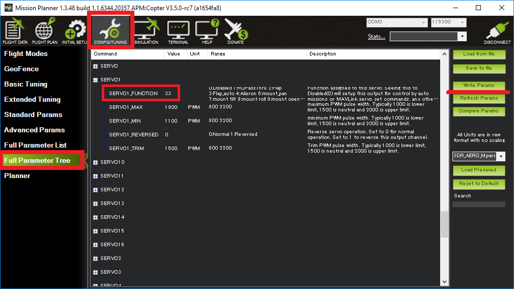 - SERVO3_FUNCTION change from 35 (aka “motor3”, front-left) to 34 (motor #2, back-left)