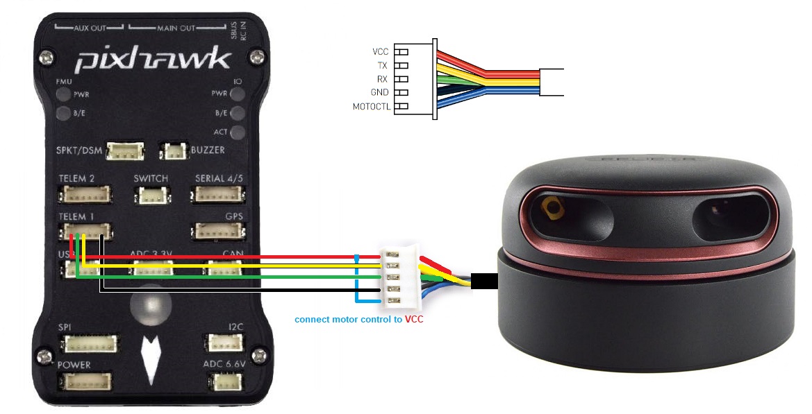 The lidar can be connected to the flight controller’s serial input as shown above. If using a Pixhawk/Pixhawk2 Telem1 (aka Serial1) should be used because it is more capable of providing the required 1.5A.