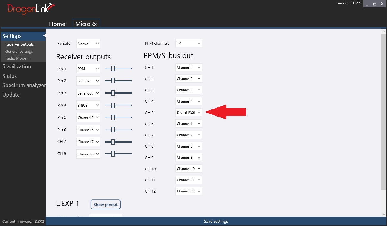 The example below shows how to assign channel 5 to embed RSSI on a DragonLink RC receiver: