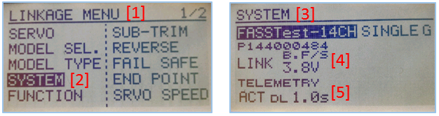 - Within “SYSTEM” menu, goto the protocol selection tab and choose “FASSTest-14CH” protocol [3] .