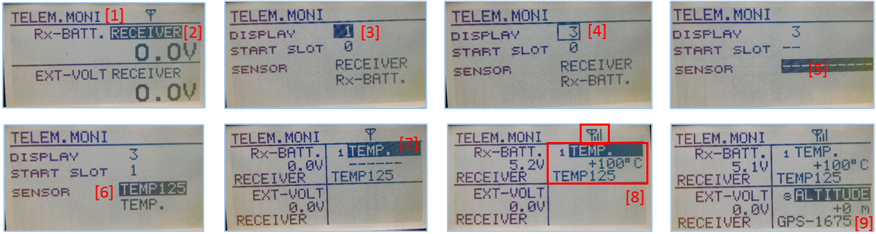 - Press “HOME/EXIT” to return to “TELEM.MONI” display and to see the RSSI / FER value as a “Temperature” [7].