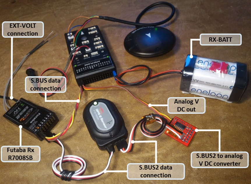 A basic setup using a Futaba R7008SB receiver and an additional S.BUS2 GPS Multi Sensor is shown in the image below. A similar setup should work using a Futaba R7003SB receiver.