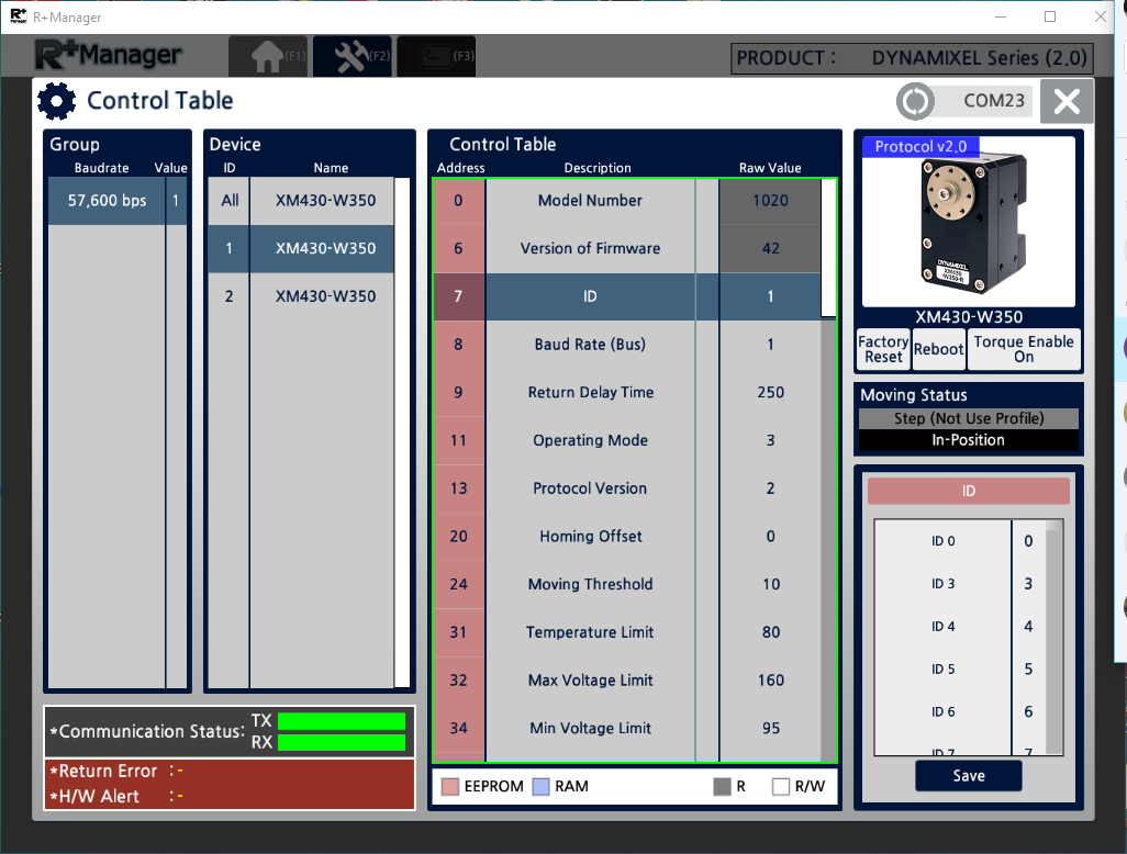 The ID for each servo needs to be set using the R+ Manager configuration tool