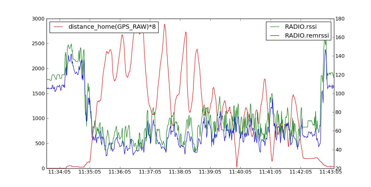 The graph below shows the ground and remote receiver strength vs distance from home (in meters) for a test flight of a 3DR Radio (SiK implementation) on a SkyFun plane. The ground based radio was attached to a 3.5dB flat patch antenna. The SkyFun had a small ‘wire’ antenna. The graph shows the vehicle reached a distance of nearly 3km and the link was completely maintained throughout the flight.