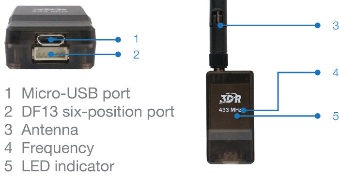 The radio has a micro-USB port, and a DF13 six-position port. The following sections explain how to connect these to flight controllers and ground stations.