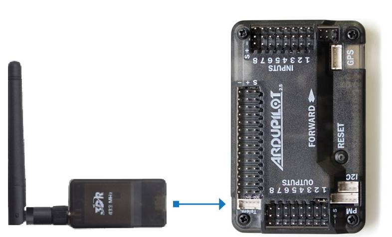 Use the 6-to-5 pin DF13 connector to connect the radio to your APM2’s Telem port Because of the limited number of serial ports on the APM2.x, the telemetry radio cannot be used while the board is also plugged in with the micro USB port.
