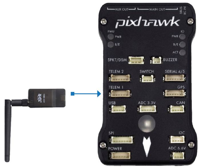 Use the 6 pin DF13 connector that should have come with the radio to connect the radio to your Pixhawk’s “Telem 1” (“Telem 2” or “Serial 4/5” can also be used but the default recommendation is “Telem1”).