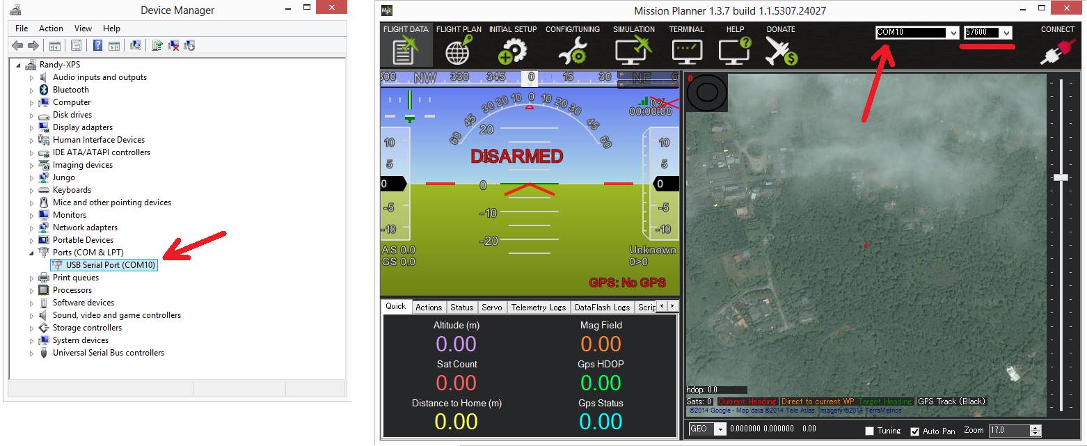 Connecting the radio to your Windows PC is as simple as connecting the micro USB cable (which should have been included with the radio) to your PC. The necessary drivers should be installed automatically and the radio will appear as a new “USB Serial Port” in the Windows Device Manager under Ports (COM & LPT). The Mission Planner’s COM Port selection drop-down should also contain the same new COM port.