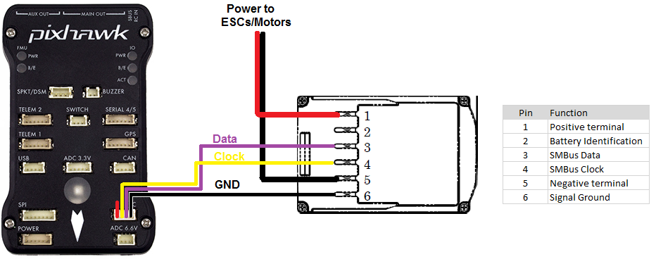 SMBus is close enough to I2C that the GND, SDA and SCLK lines from the battery can be connected to the Pixhawk’s I2C connector (see I2C pin assignment on this page).