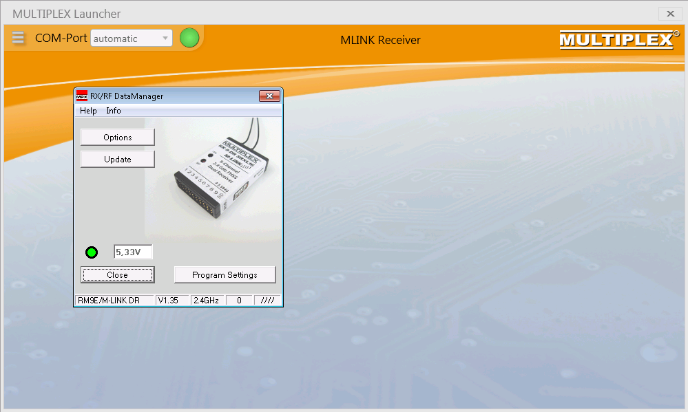 - MULTIPLEX Launcher will detect the connected device automatically and will open the “RX/RF DataManager”-Window.