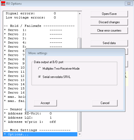 - In the “RX-Options” Window scroll down to “More Settings”. In the “More Settings” section double-click “* Options…” to open the “More setting”-Window and select “Serial servodata SRXL” as data output at B/D port. Close the “More setting”-Windows by clicking “Accept”.