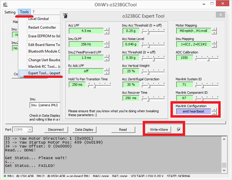 In addition to the regular gimbal configuration described on the STorM32-BGC wiki, the MAVlink heartbeats should be enabled through OlliW’s o323BGCTool’s Tools | Expert Tool screen as shown below.