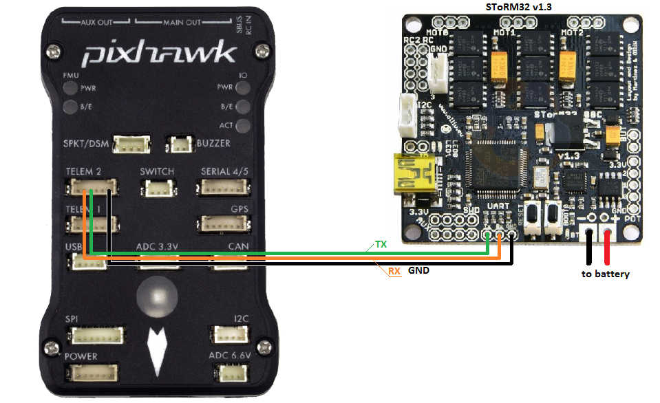 You will need to solder 3-pins of a DF13 6-pin cable to the gimbal controller board as shown above and then plug the other end into one of the Pixhawk’s Telemetry ports (Telem1, Telem2, Serial4).